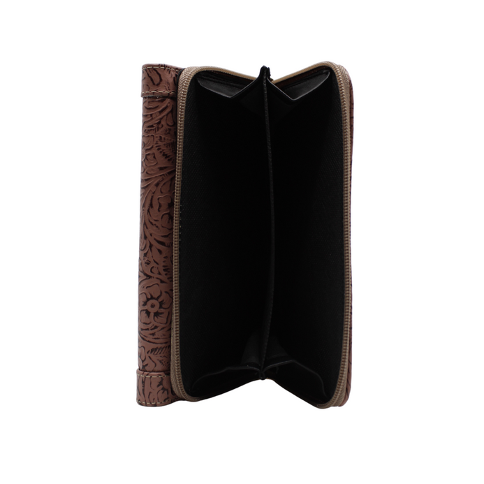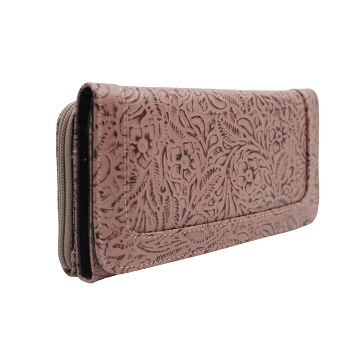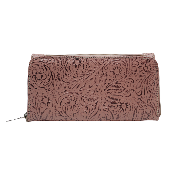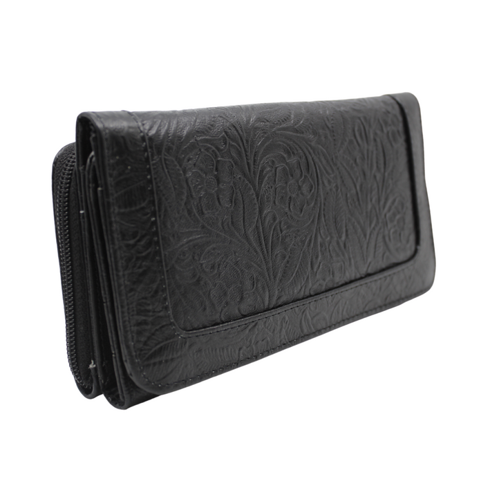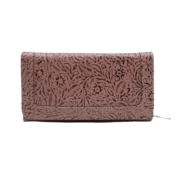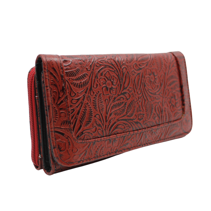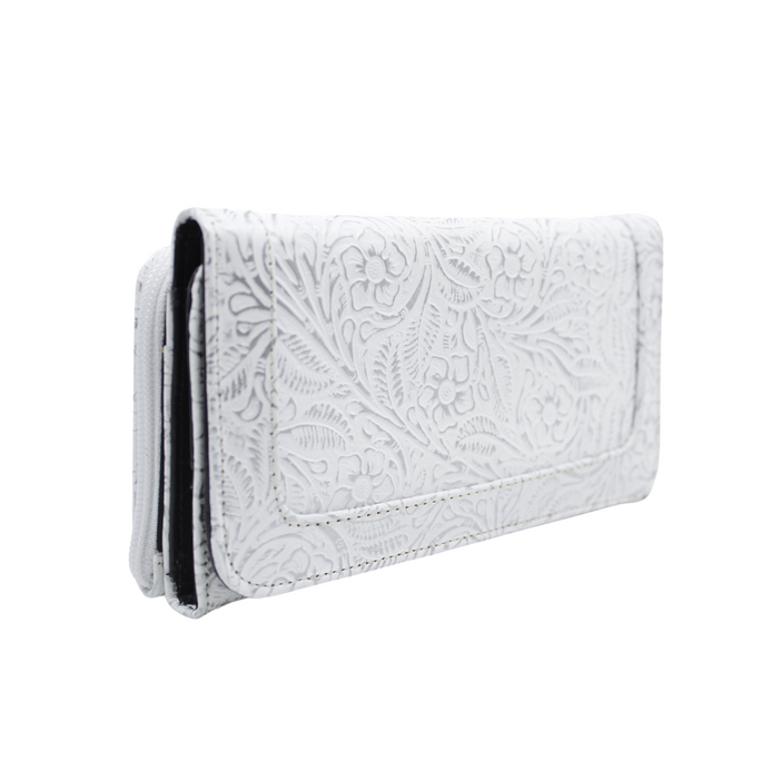 Billetera / cartera para dama en piel de ternera grabada en flores. Tan elegante que puede lucir como cartera de mano o bien llevarla dentro del bolso. Dos compartimentos principales. Uno con cierre y cuenta con dos divisiones. El otro cierra con broche de imán y alberga en su interior 12 espacios para tarjetas o identificaciones y 4 más para billetes o documentos. Tiene un discreto espejo. Mide 19 cms de largo, 10 cms de alto y de 3.5 a 4 cms de ancho. Una pieza de diseño clásico que va con tu estilo cualquiera que éste sea.