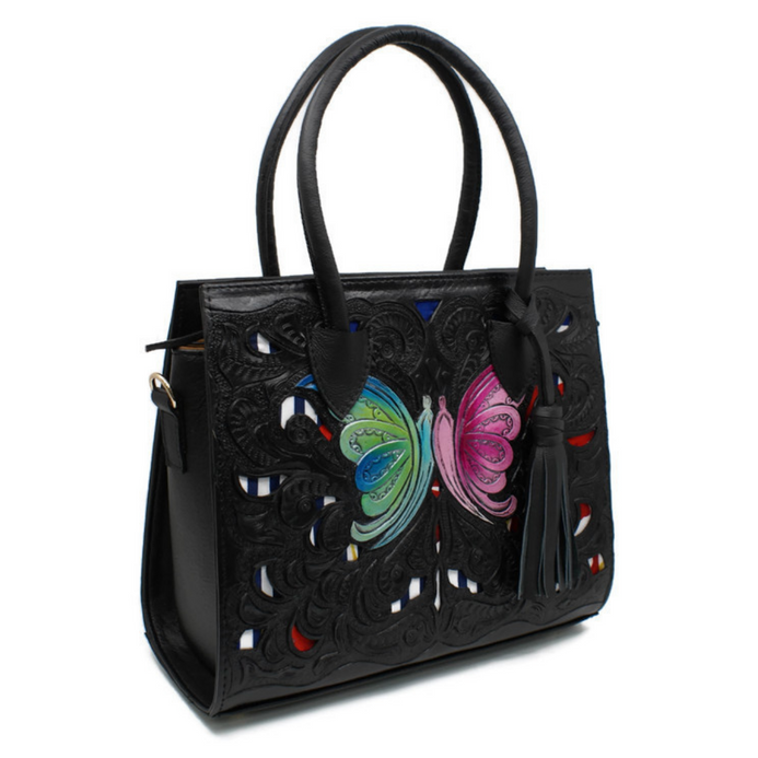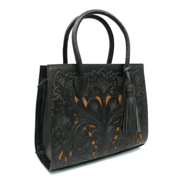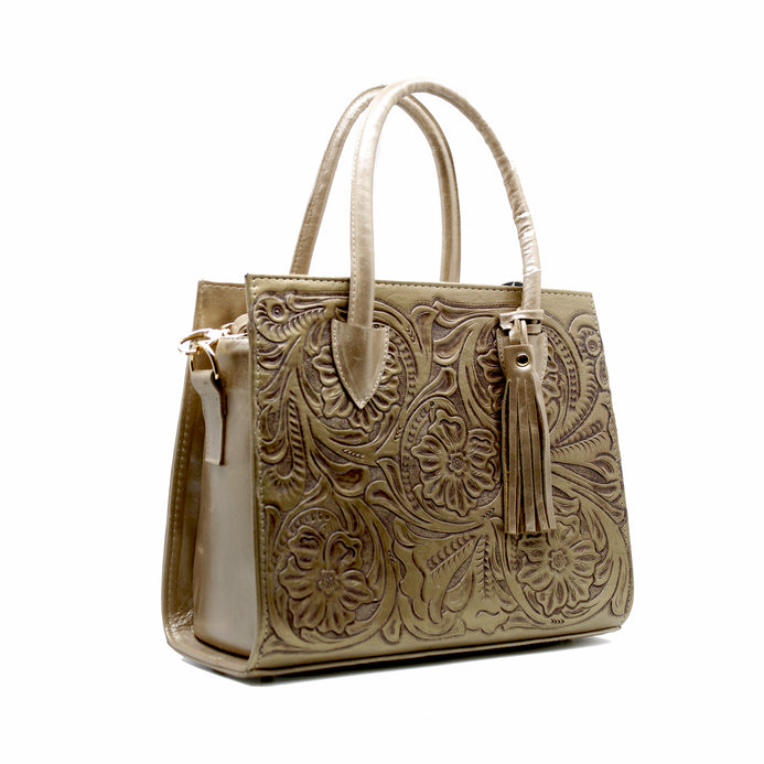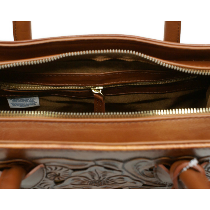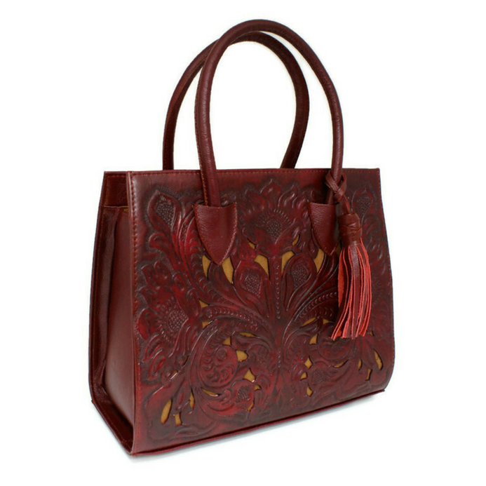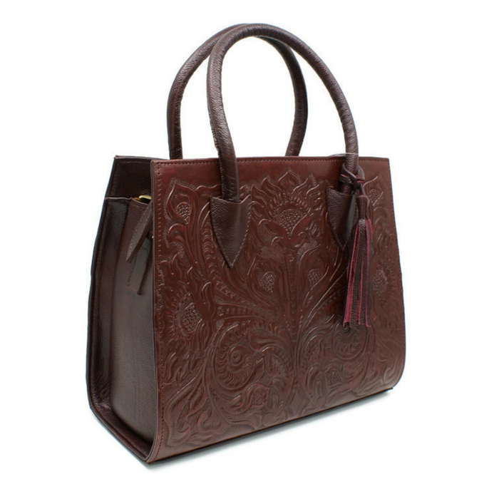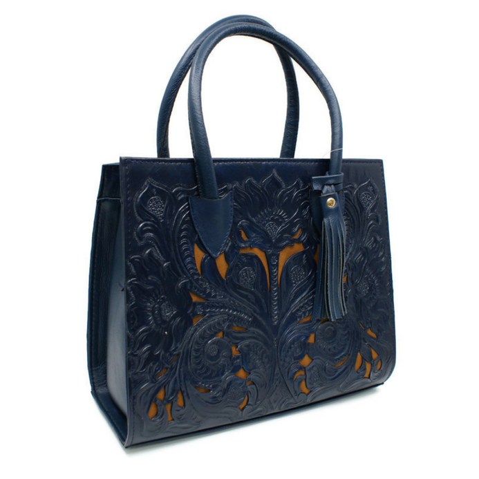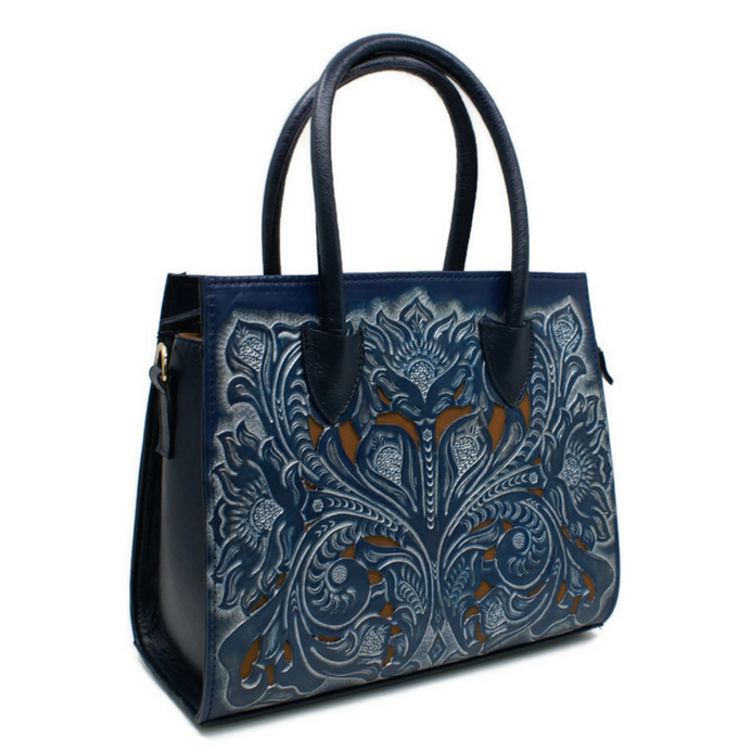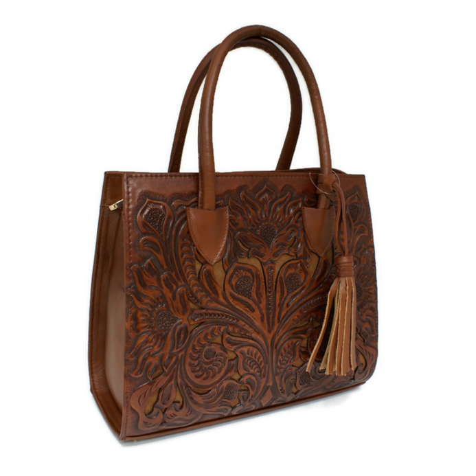 Hermoso bolso modelo Ada. Realizado en piel. Cincelado a mano. Este bolso es una edición especial y como todos nuestros productos es elaborado por artistas Leoneses. Para lucir como bolso de mano. La correa o bandola también de piel, es desmontable para llevar de lado al hombro o cruzado. Herrajes de calidad. Cierre externo en la parte superior y también en la bolsa trasera. Su interior es de material textil y cuenta con un organizador doble además de un compartimento con cierre en la parte interna.