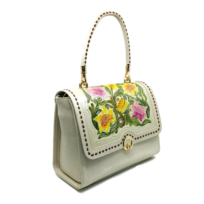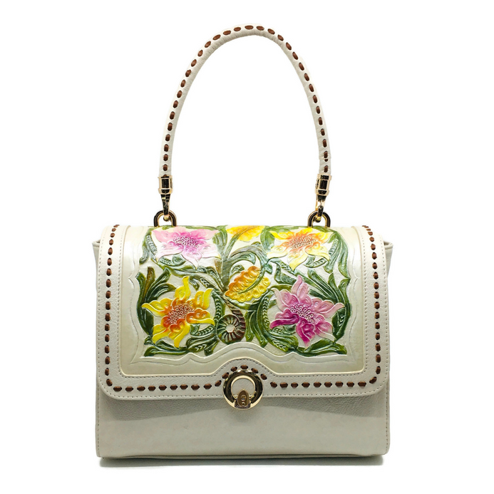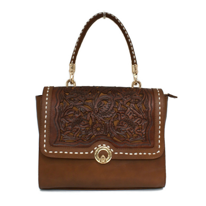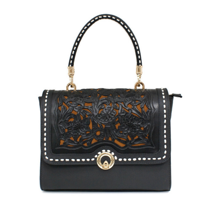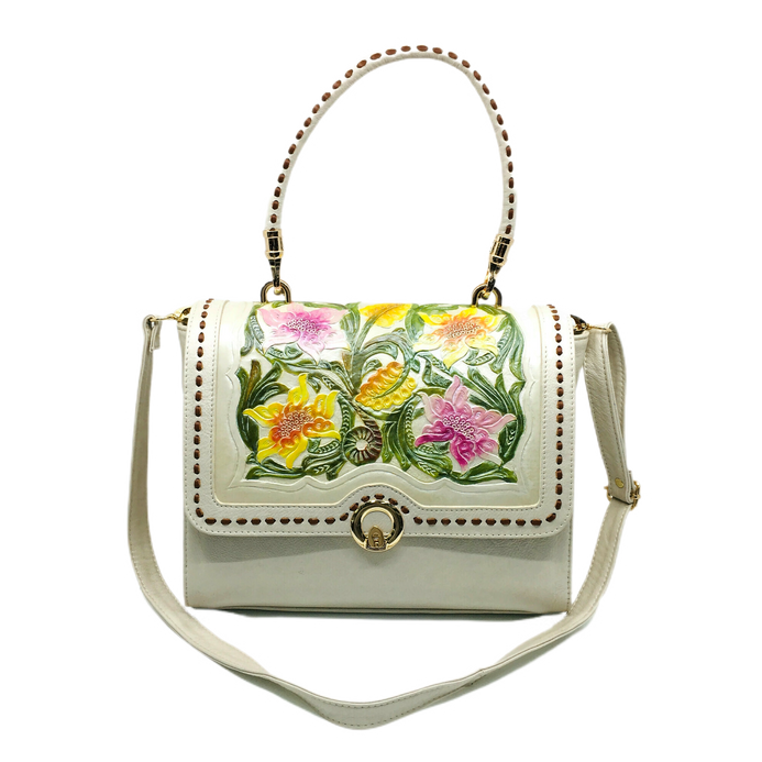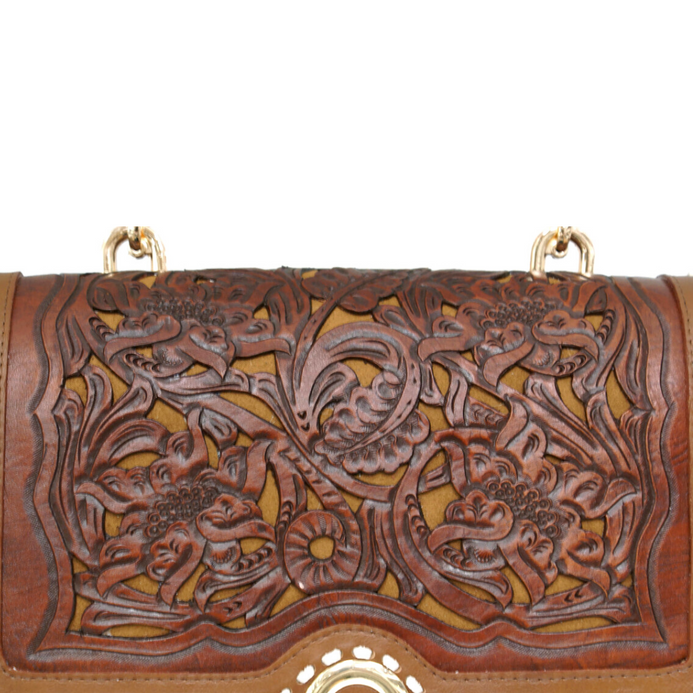 Hermoso bolso realizado en piel genuina. Cincelada a mano modelo Paola. Este bolso es una edición especial y como todos nuestros productos ha sido elaborado a mano por artistas Leoneses. Cuenta con cierre superior y en la parte trasera. Asa de gran amplitud para llevar al hombro. La correa o bandola también de piel, es desmontable para llevar de lado al hombro o cruzado. Adorno de pespunte en el asa y en la tapa. Herrajes de calidad. Cierre externo en la parte superior y también en la bolsa trasera. Su interior es de material textil y cuenta con un organizador doble además de un compartimento con cierre.