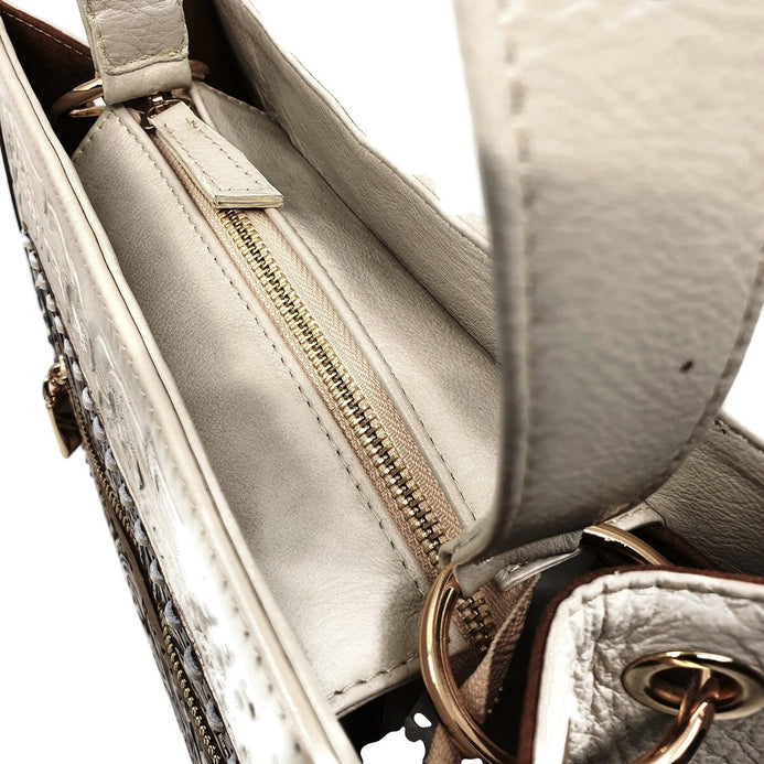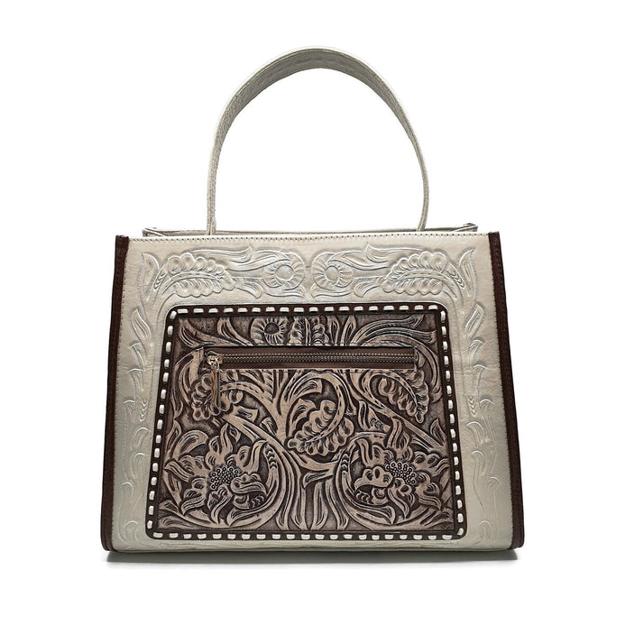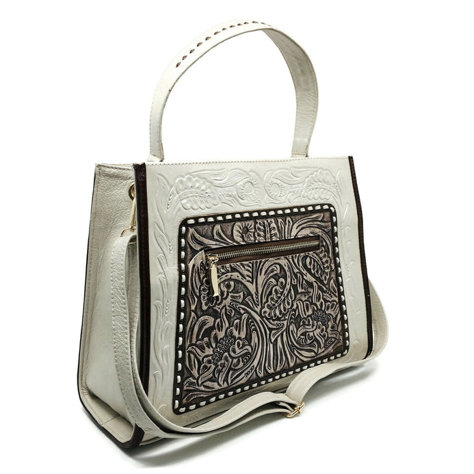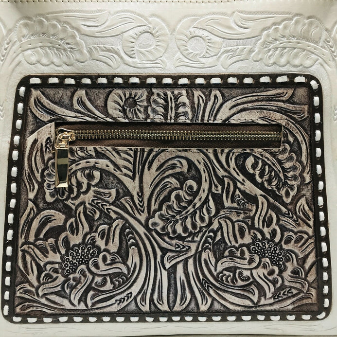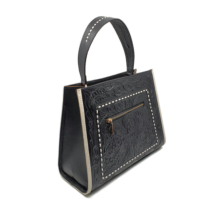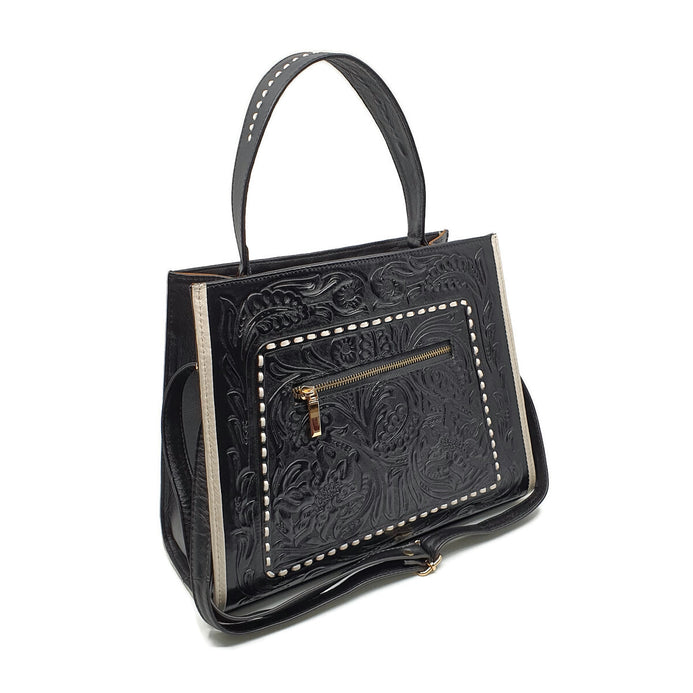 Exquisita pieza cincelada a mano. Piel 100%. Este bolso ha sido elaborado por artistas mexicanos, de León, Guanajuato. Es un accesorio elegante y exclusivo. Asa amplia para llevar al hombro. Su correa también en piel te permite usar cruzada; el asa es desmontable. Adornos de pespunte en asa y frente. Cierre en la parte superior, frente y atrás. Herrajes de calidad. Interior textil de excelentes acabados, organizador y bolsa con cierre.