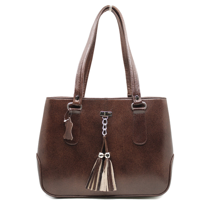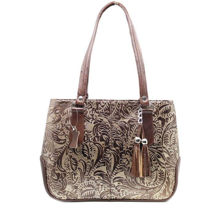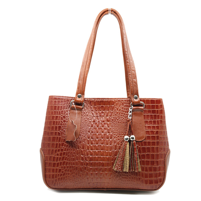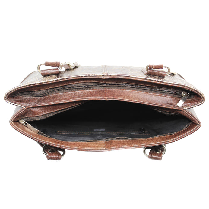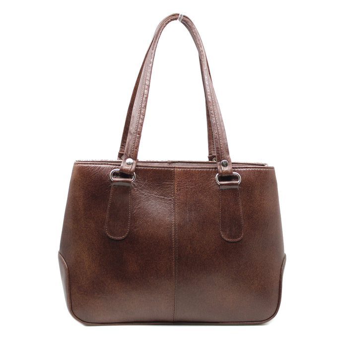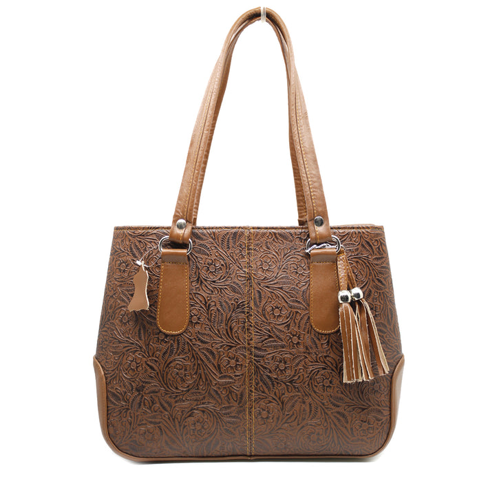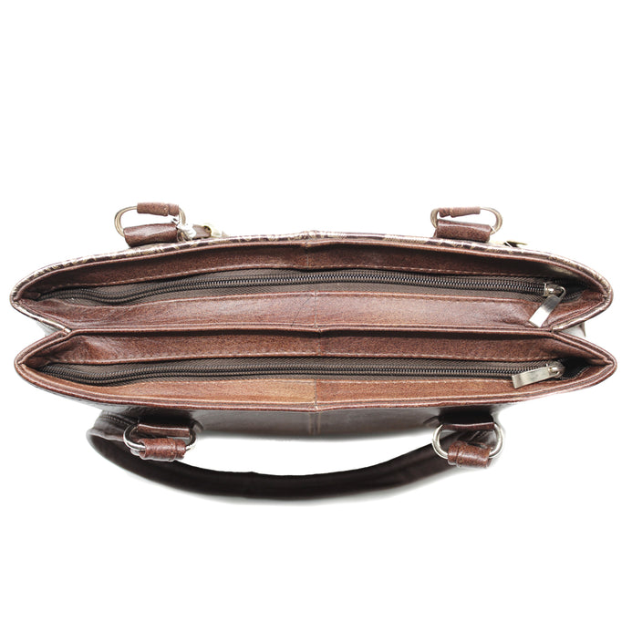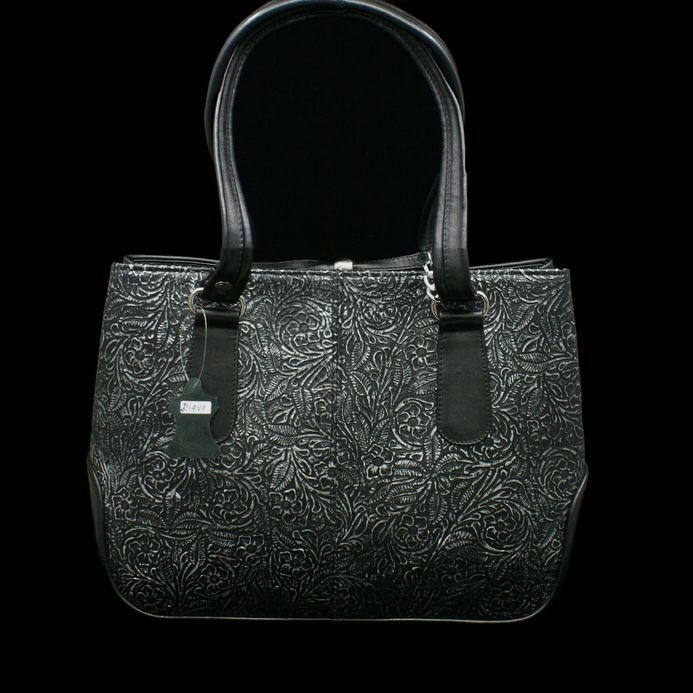 Exclusivo bolso realizado en piel de ternera de exquisita textura. En su cara frontal liso o grabado finamente en flores o exótico. Dos compartimentos independientes con cierre cada uno. Asas amplias para usar al hombro o bien como bolso de mano. Medidas: Longitud 30 - 35 cms., alto 25 cms y ancho en base 11 cms. Interior textil , de un lado bolsa con cierre y organizador doble.