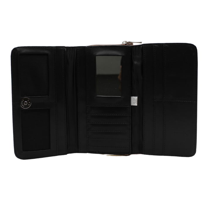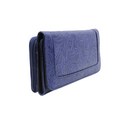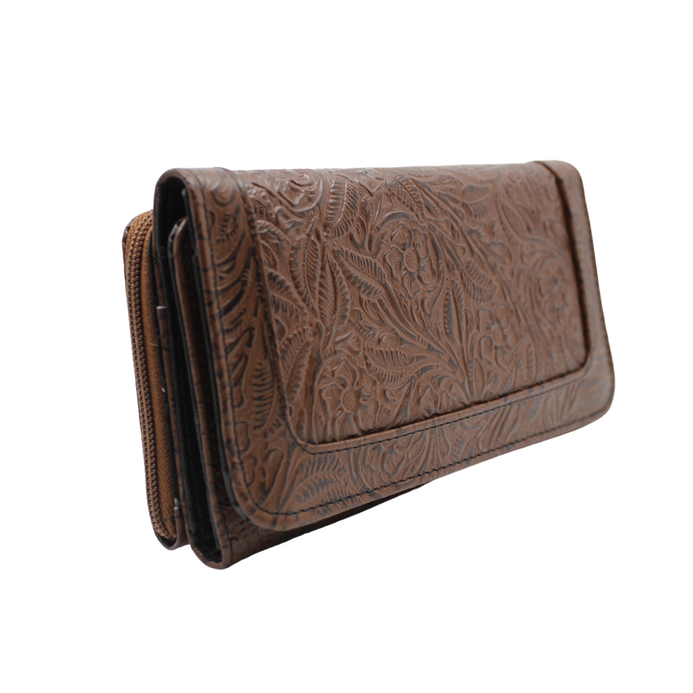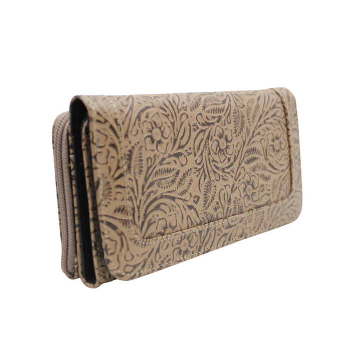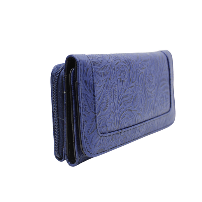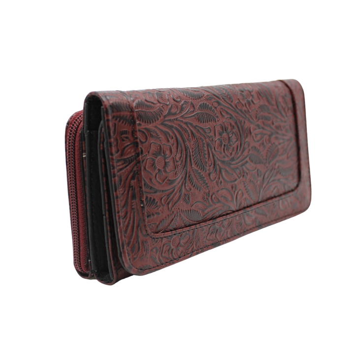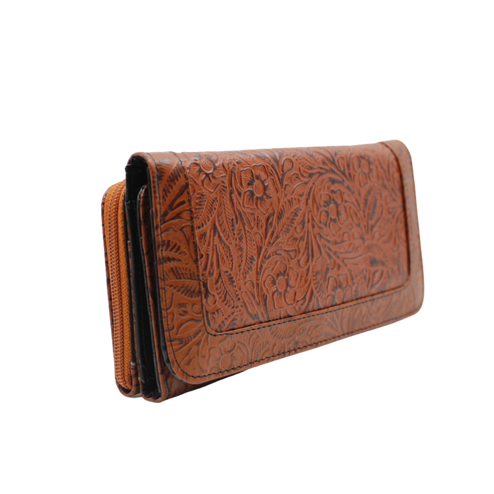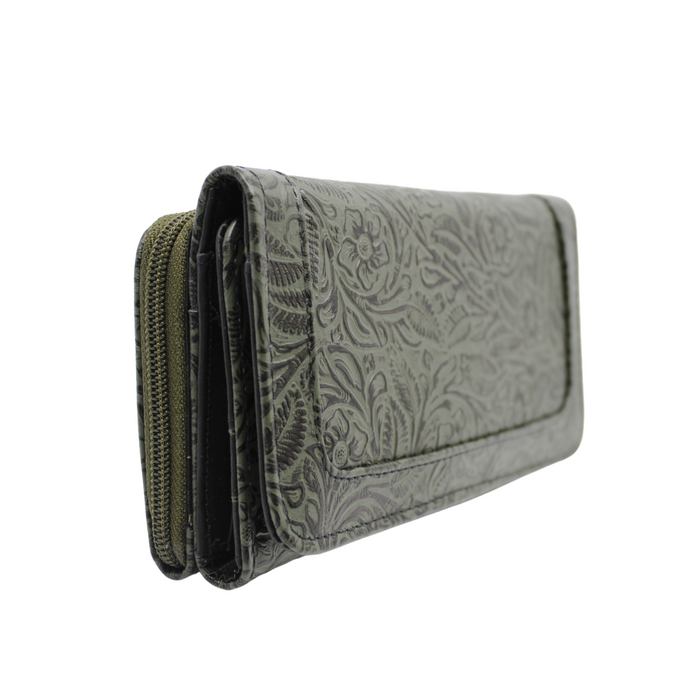 Billetera / cartera para dama en piel de ternera grabada en flores. Tan elegante que puede lucir como cartera de mano o bien llevarla dentro del bolso. Dos compartimentos principales. Uno con cierre y cuenta con dos divisiones. El otro cierra con broche de imán y alberga en su interior 12 espacios para tarjetas o identificaciones y 4 más para billetes o documentos. Tiene un discreto espejo. Mide 19 cms de largo, 10 cms de alto y de 3.5 a 4 cms de ancho. Una pieza de diseño clásico que va con tu estilo cualquiera que éste sea.