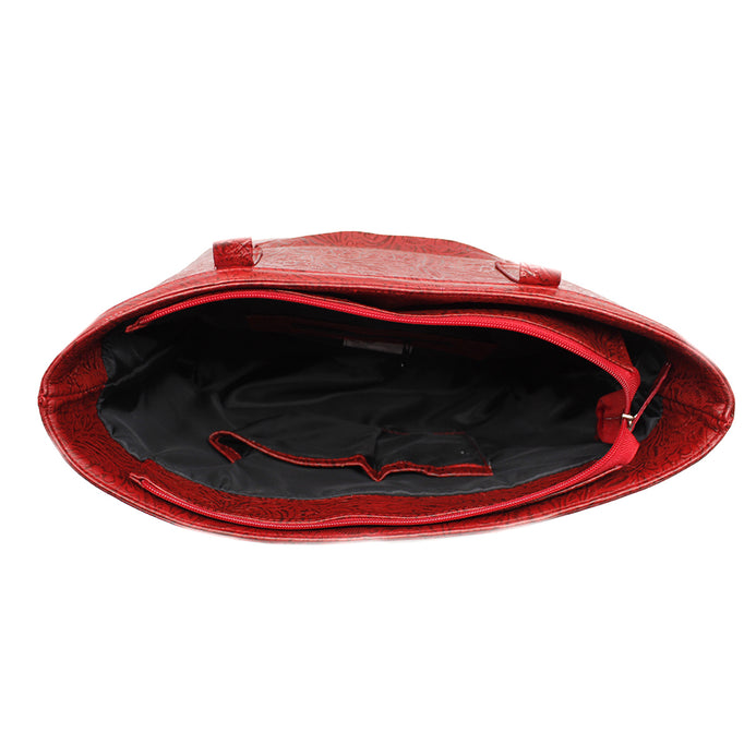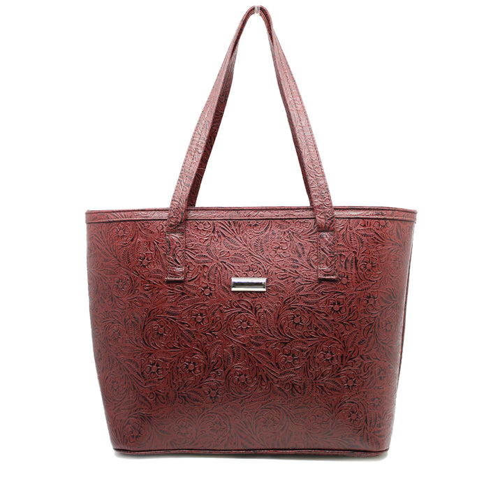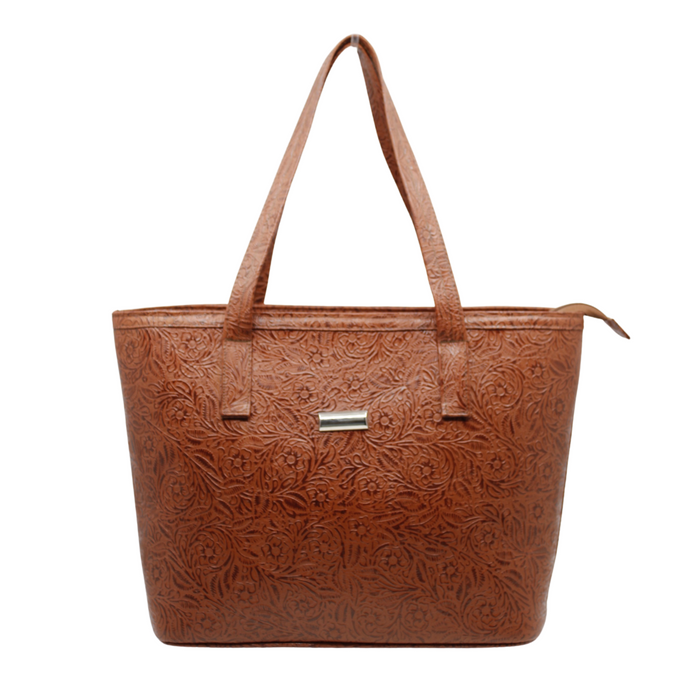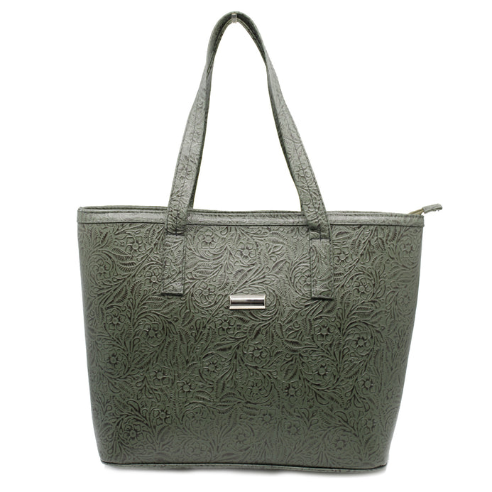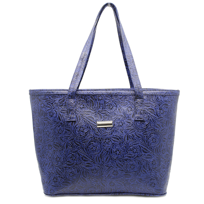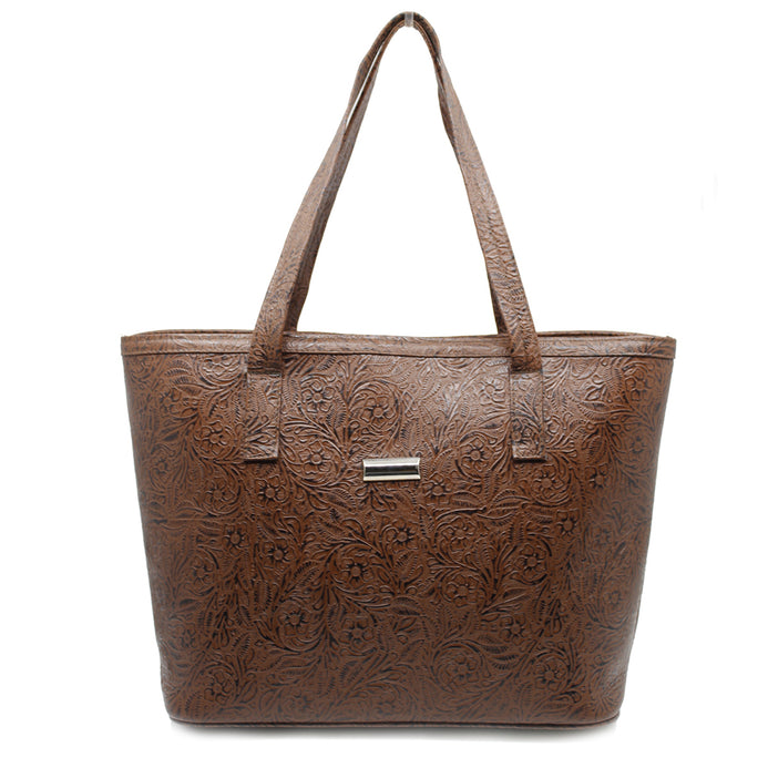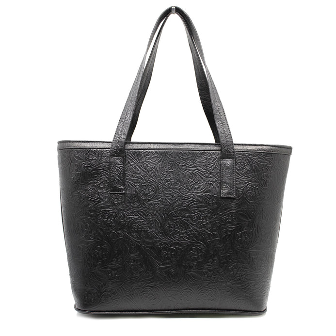 Bolso de piel 100%. Grabado en flores. Tipo tote. Asas de gran amplitud para llevar al hombro o como bolso de mano. El look casual y práctico de este clásico que no puede faltar en tus accesorios. 32 cms en el largo de la base, 38 en la parte superior, 27 de alto y 13cms de ancho. Su forro es textil, y tiene en su interior por un lado una bolsa con cierre; del otro lado un organizados de dos compartimentos.