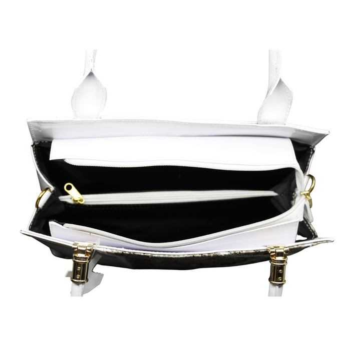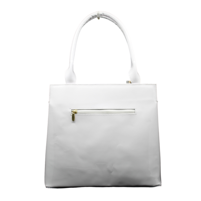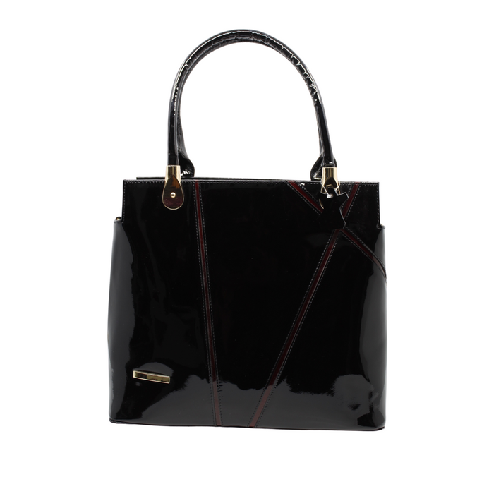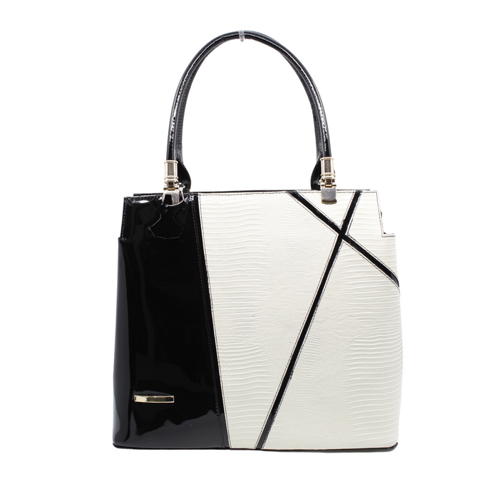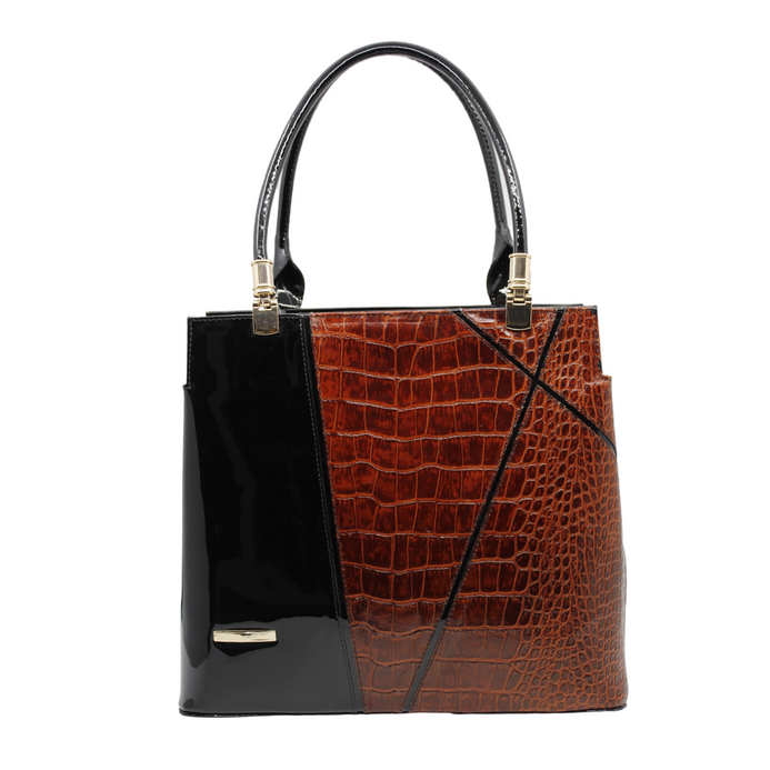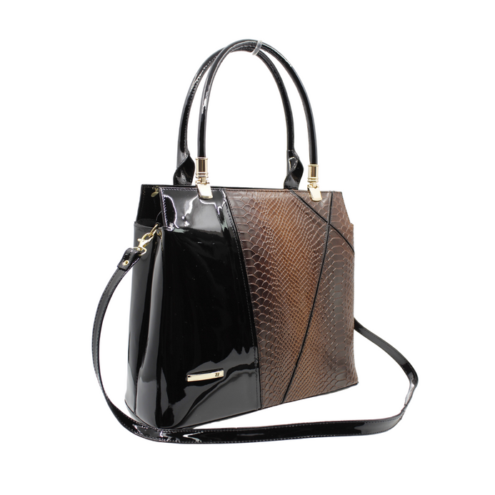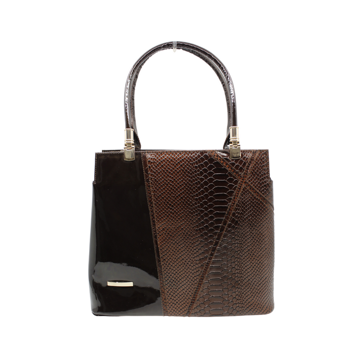 Precioso bolso en charol de piel de ternera. Liso o combinado con piel grabada en apariencia exótica. Con asas también en charol y correa larga para llevar al hombro o lucir como bolso de mano. Forro textil, dos compartimentos internos divididos por bolsa con cierre; además una bolsita más con cierre en uno de los lados del interior. Mide 32 cms de largo, 28 cms de alto Y 13 cms de ancho. Este es un modelo de edición limitada y en este caso por sus materiales, colores y texturas, son piezas únicas y exclusivas.