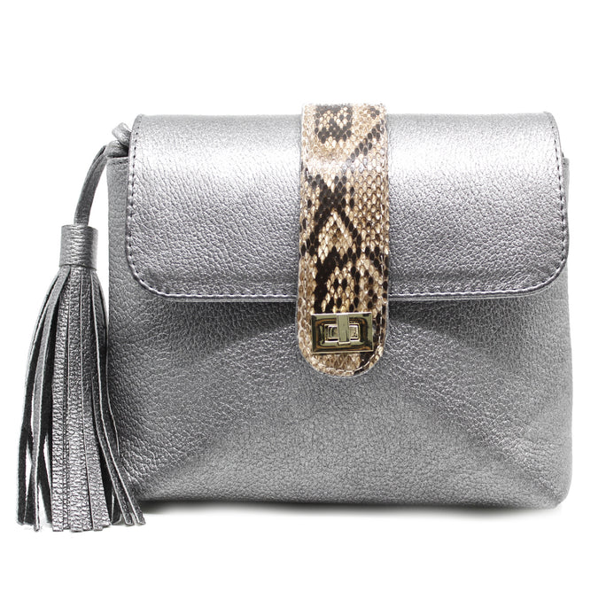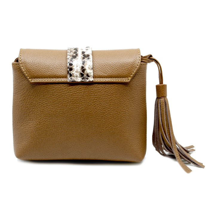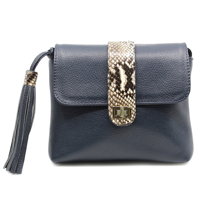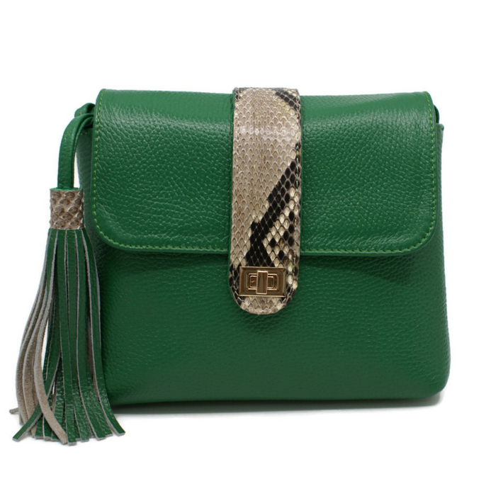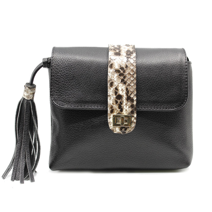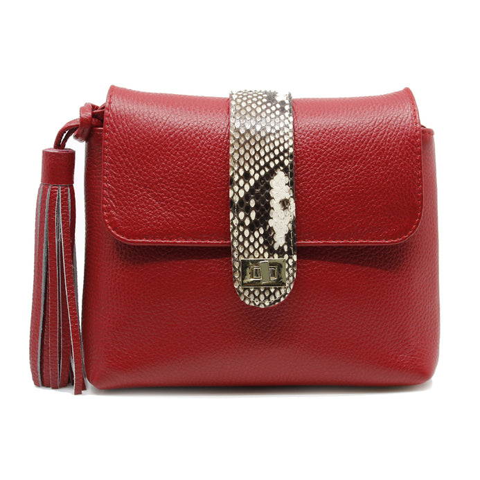 Bolso de piel tipo cross body. De tendencia. Elaborado en piel de ternera 100% acabado floater, con adorno de piel exótica genuina. Muy práctico pues lo puedes llevar al hombro o bien cruzado. La motita de adorno también es de piel. El interior es textil y tiene bolsita con cierre de un lado y del otro bolsita/organizador doble. Cuenta con cierre superior para mayor seguridad lalengüeta cierra con broche giratorio. Mide 22 cms de largo X 20 de alto y 5 cms de ancho. Como ves es un imperdible!